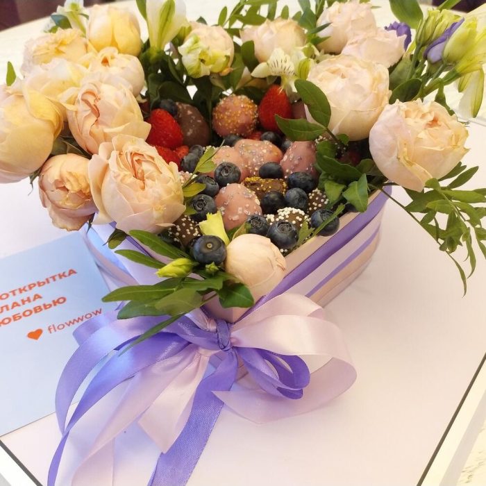 Альстромерия – 3 шт.Упаковка дизайнерская – 1 шт.Фисташка пучок – 1 шт.Коробка сердце большая – 1 шт.Голубика 100гр – 1 шт.Клубника в шоколаде callebaut (бельгия) – 25 шт.розы кустовые микс – 5 шт.
