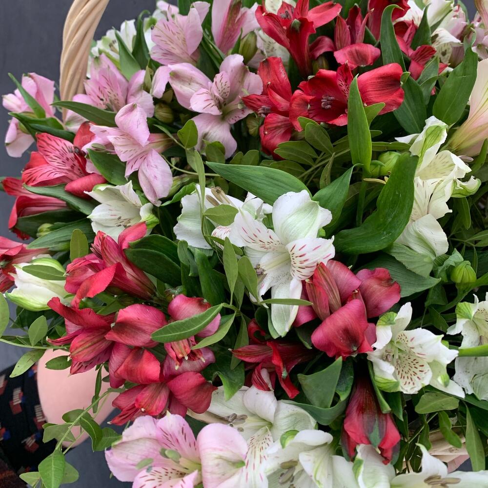 Альстромерия – 17 шт.Зелень – 10 шт.Оазис – 1 шт.Корзина плетеная – 1 шт.