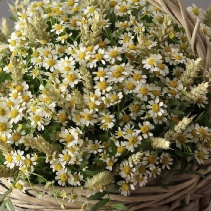 Матрикария – 29 шт.рожь пучок – 1 шт.Фисташка пучок – 1 шт.Оазис флористический – 2 шт.Корзина плетеная – 1 шт.