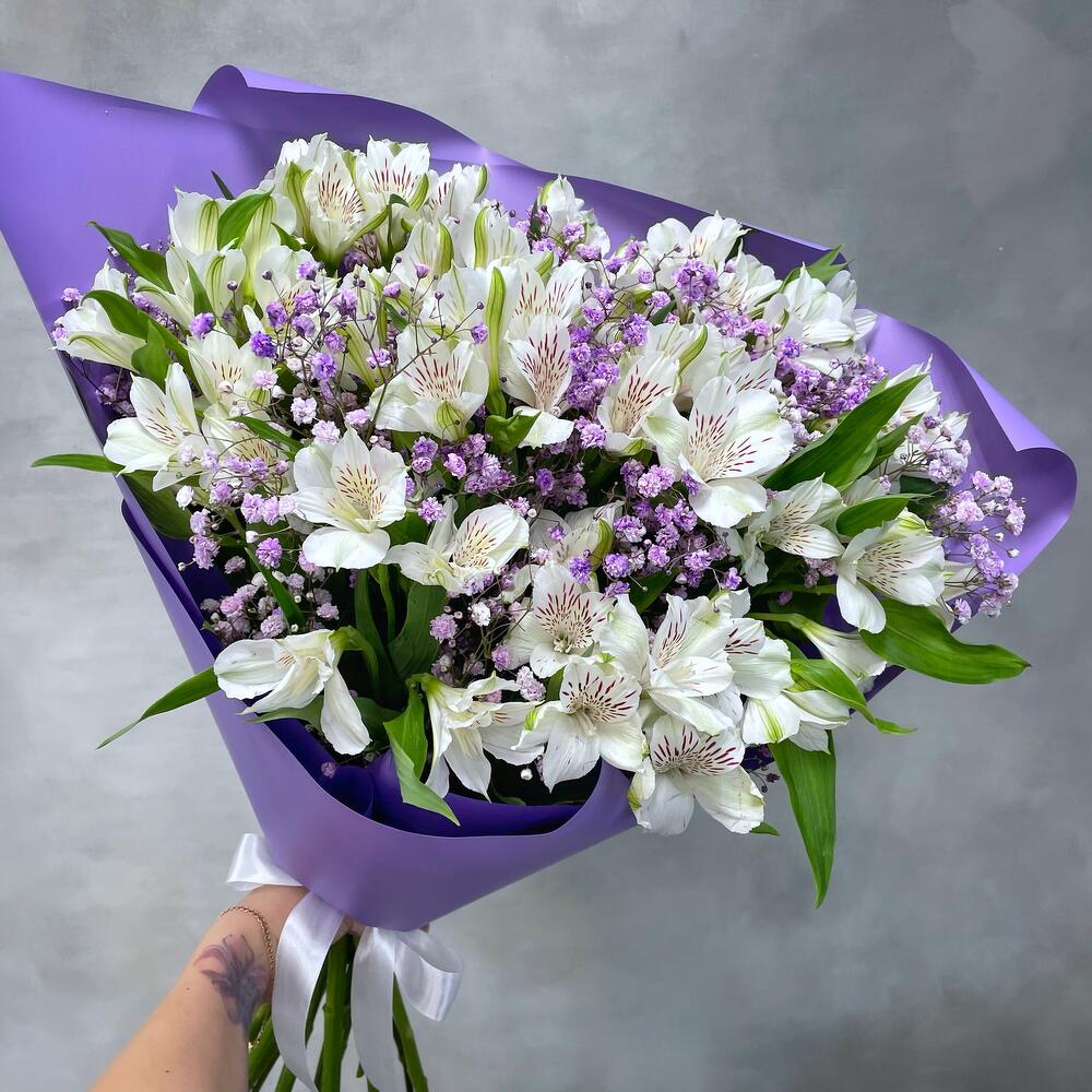 Стойкий букет в духе Прованса из нежной белой альстромерии с сиреневой гипсофилой в составе. Букетик на свидание, День рождения и просто без повода для хорошего настроения.