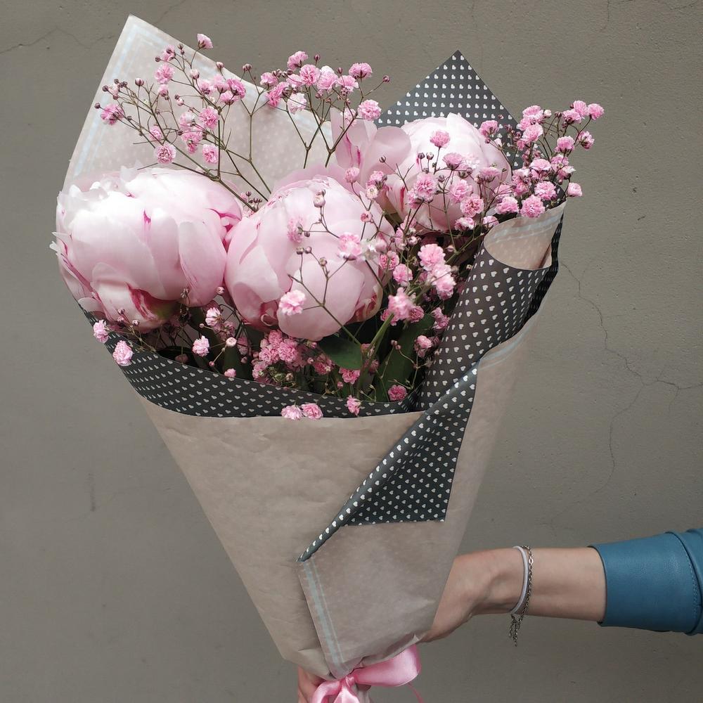 Пион розовый – 3 шт.Гипсофила – 1 шт.Упаковка крафт цветной – 1 шт.