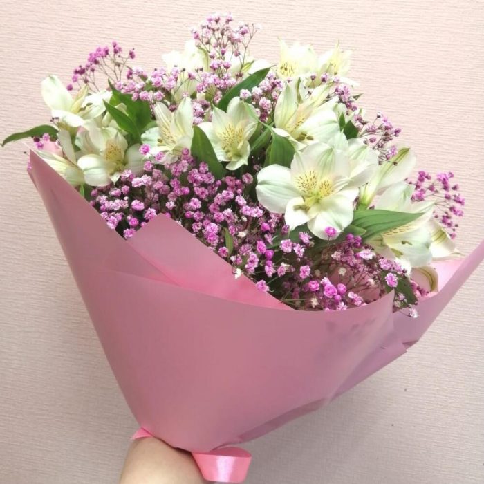 Альстромерия – 5 шт.Гипсофила – 2 шт.Лента – 1 шт.Упаковка дизайнерская – 1 шт.