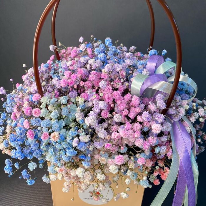Стильная, сочная композиция из гипсофилы в сумочке станет прекрасным подарком на любой праздник или приятным сюрпризом в качестве комплимента