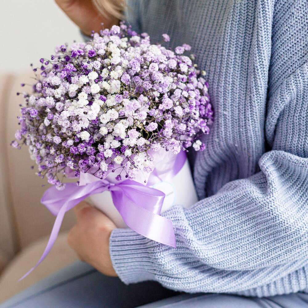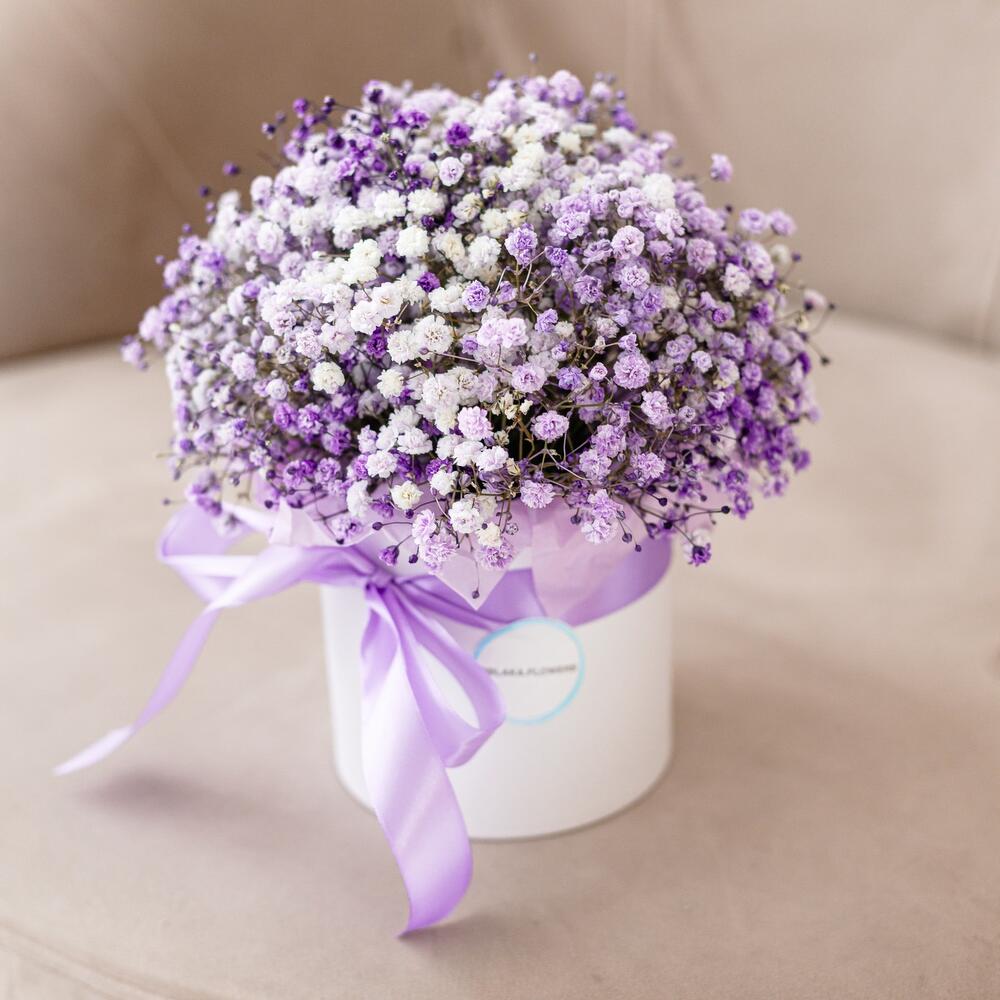 Очаровательная, воздушная композиция из гипсофилы, в шляпной коробке.Цветы стоят в специальной флористической губке,что позволяет им больше оставаться свежими и радовать получателя. Так же композиция в коробке это очень удобно и эффектно, так как не надо ставить букет в вазу и менять воду. Необходимо лишь подливать в губку воду.Инструкция по уходу за цветами прикреплена к каждому заказу.Цветы гипсофилы отличаются стойкостью и даже при высыхании не теряют, декоративности и цвета. Что позволяет, долгое время украшать интерьер в качестве сухоцветов.Подпишем открытку с вашими пожеланиями бесплатно