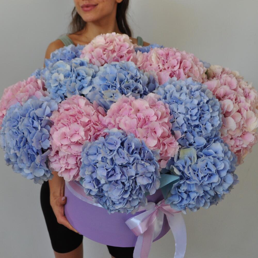 Гортензия – 21 шт.Лента атласная – 2 шт.Коробка шляпная – 1 шт.Оазис флористический – 6 шт.