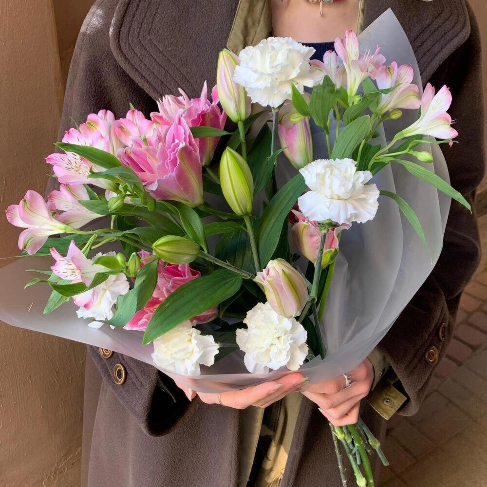 Альстромерия – 2 шт.Гвоздика белая – 5 шт.Авторская упаковка – 1 шт.лилия махровая розовая – 2 шт.