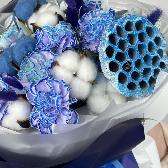 Гвоздика – 7 шт.Хлопок натуральный – 8 шт.Лагурус (сухоцвет) – 7 шт.Лотос (коробочка) – 1 шт.Тишью – 2 шт.Пленка матовая – 2 шт.