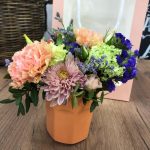 Диантус – 3 шт.Кустовая хризантема – 1 шт.Лимониум – 1 шт.Статица синяя – 1 шт.Гиперикум – 2 шт.Лизиантус – 1 шт.кружка керамика – 1 шт.Оазис флористический – 1 шт.пакет с окном – 1 шт.