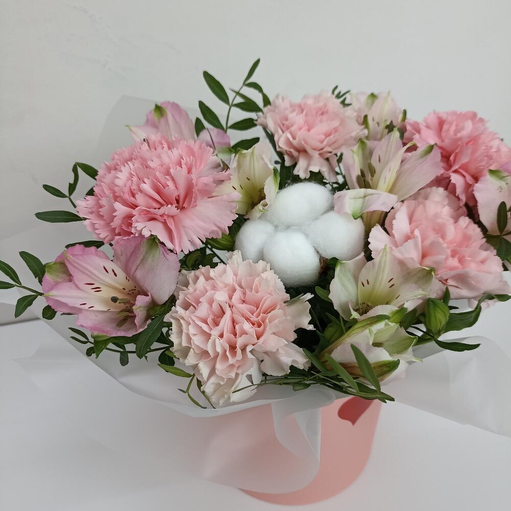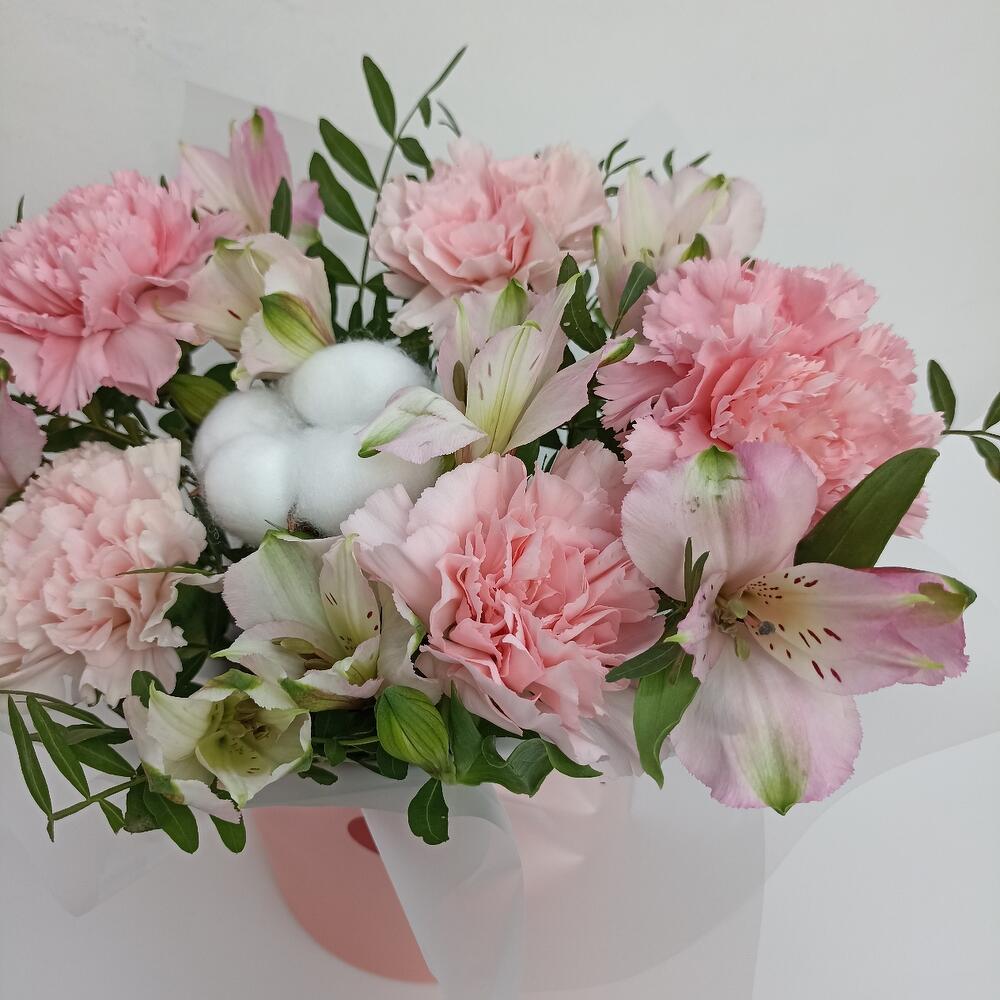 Альстромерия – 2 шт.Хлопок – 1 шт.Диантус – 5 шт.Фисташка – 2 шт.Оазис флористический – 1 шт.коробка маленькая – 1 шт.наклейка сердце – 1 шт.