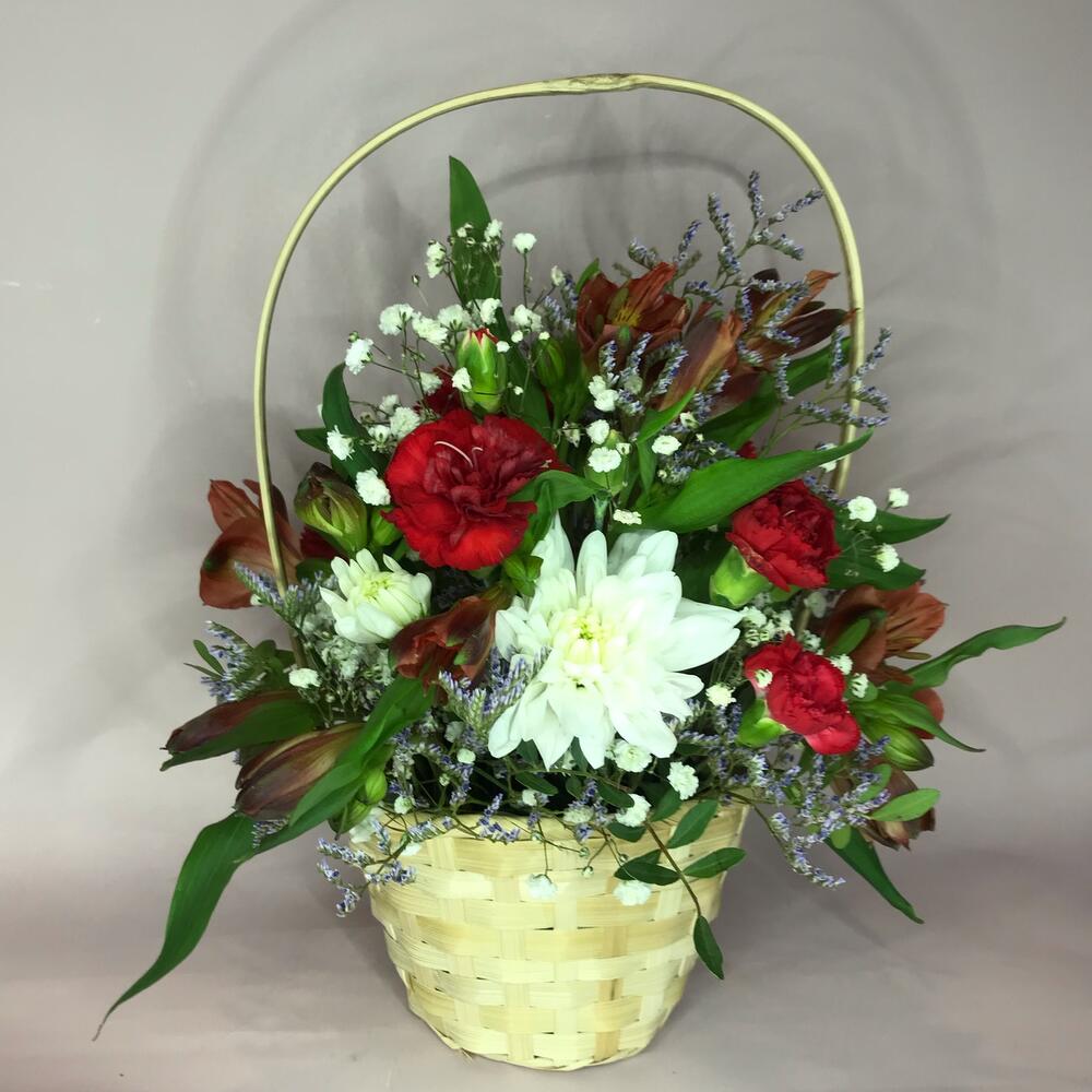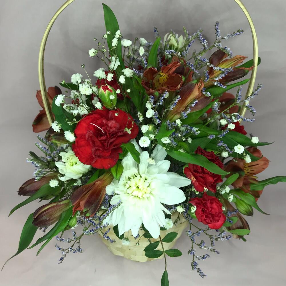 Диантус кустовой – 3 шт.Хризантема кустовая – 1 шт.Альстромерия – 3 шт.Гипсофила – 1 шт.Лимониум сиреневый – 1 шт.Корзина плетеная – 1 шт.
