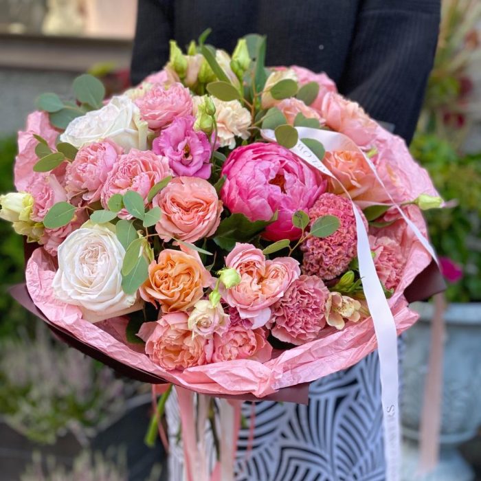 Альстромерия – 3 шт.Лизиантус – 4 шт.Пион – 1 шт.Эвкалипт – 4 шт.Диантус – 7 шт.Роза пионовидная кустовая – 3 шт.Роза пионовидная – 7 шт.Атласная лента – 2 шт.Дизайнерская упаковка – 2 шт.