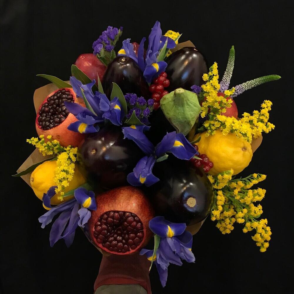 баклажаны – 4 шт.Гранат – 3 шт.Лимон – 3 шт.Слива – 5 шт.красная смородина или калина – 2 шт.ирисы – 5 шт.Солидаго – 4 шт.Статица – 4 шт.Вероника – 4 шт.лавр или салал – 5 шт.