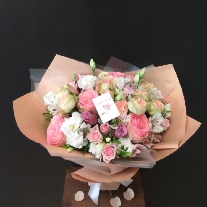 Альстромерия – 2 шт.Лизиантус – 2 шт.Фрезия – 5 шт.Кустовая роза – 5 шт.Атласная лента – 1 шт.Фисташка пучок – 2 шт.Роза одноголовая пионовидная – 2 шт.Карточка для подписи – 1 шт.Роза одноголовая эквадор 50 см – 2 шт.Пленка корейская – 2 шт.Прищепка – 1 шт.роза кения – 5 шт.