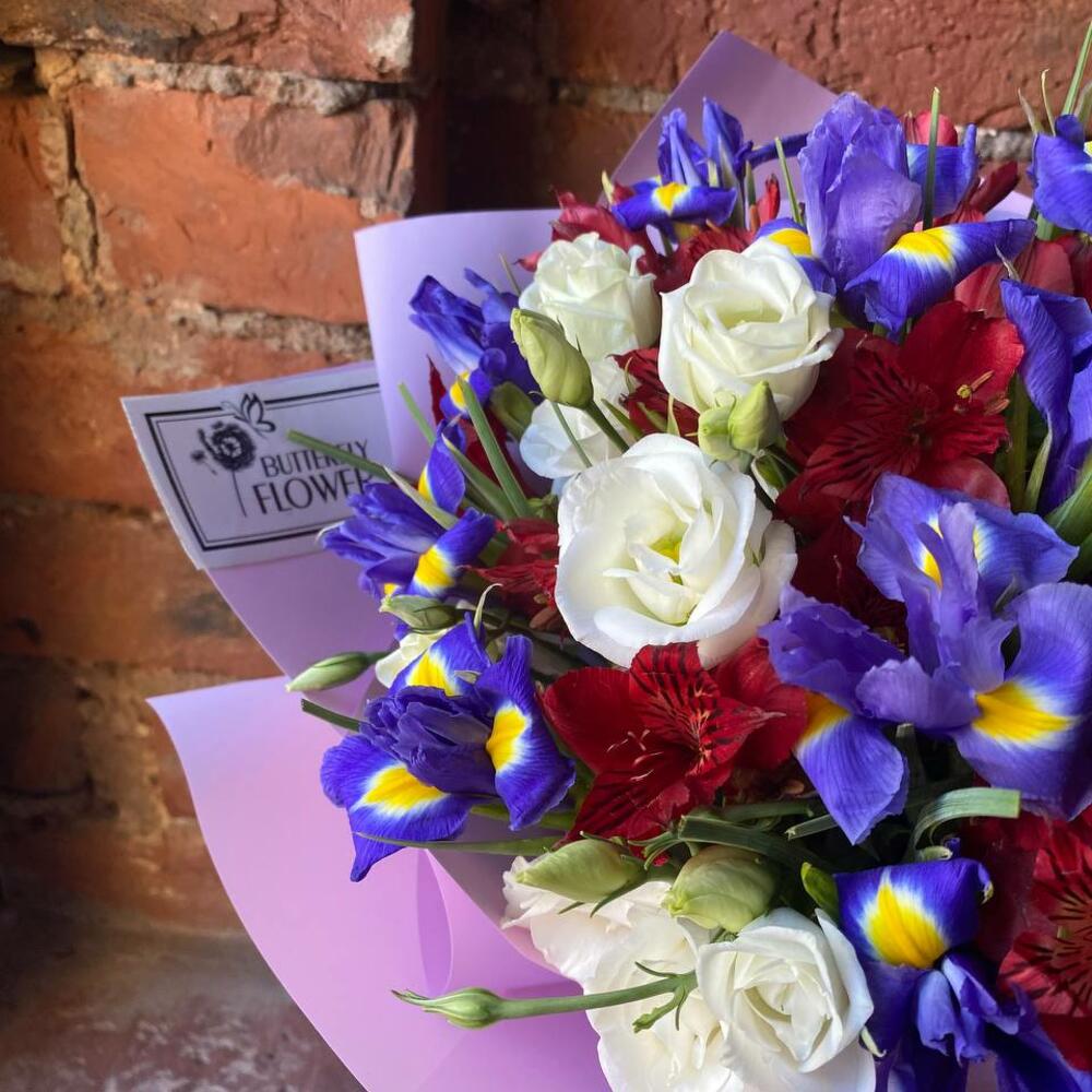 Ирис – 11 шт.Эустома – 4 шт.Альстромерия – 4 шт.Упаковка – 2 шт.