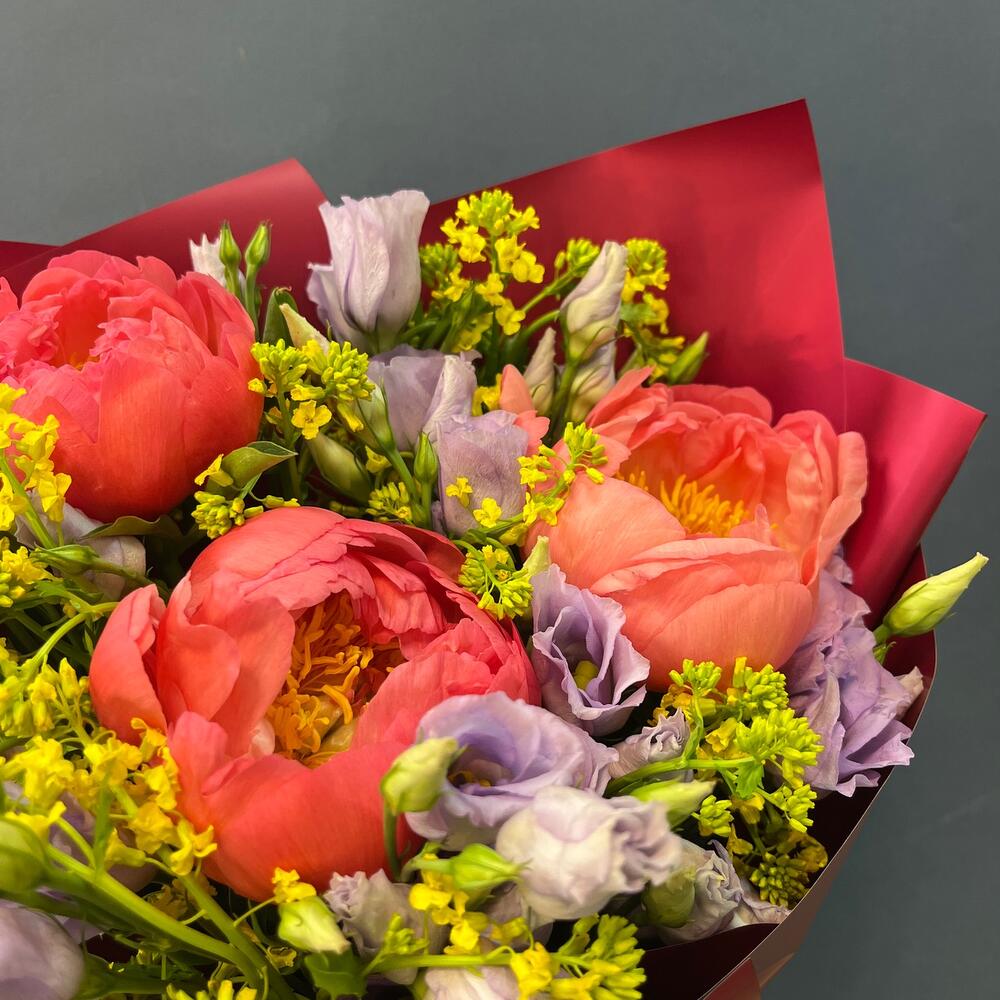 Лизиантус лавандовый – 4 шт.Упаковка корейская пленка – 1 шт.лента атласная салатовая – 1 шт.экзотика зелень желтая – 8 шт.пион премиум Коралл шарм – 3 шт.