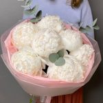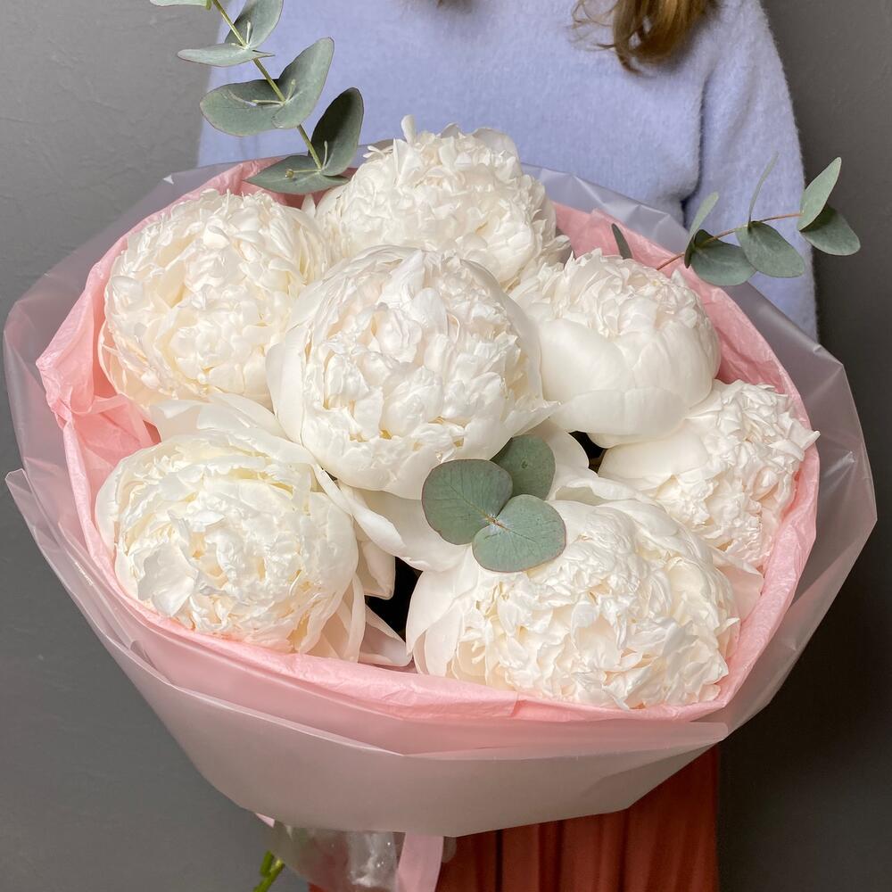 Лента атласная – 1 шт.Тишью – 4 шт.Упаковка дизайнерская – 1 шт.Эвкалипт пучок – 1 шт.пион белый премиум крупный бутон – 7 шт.