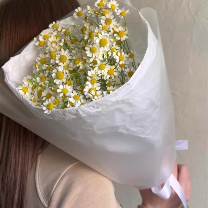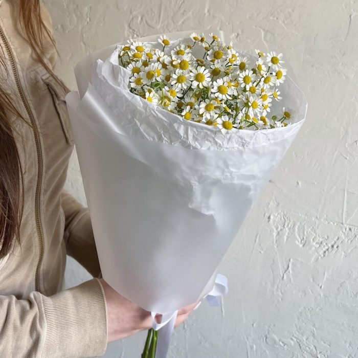 Лента атласная – 1 шт.Ромашка кустовая – 7 шт.Упаковка дизайнерская – 1 шт.Упаковка тишью – 1 шт.