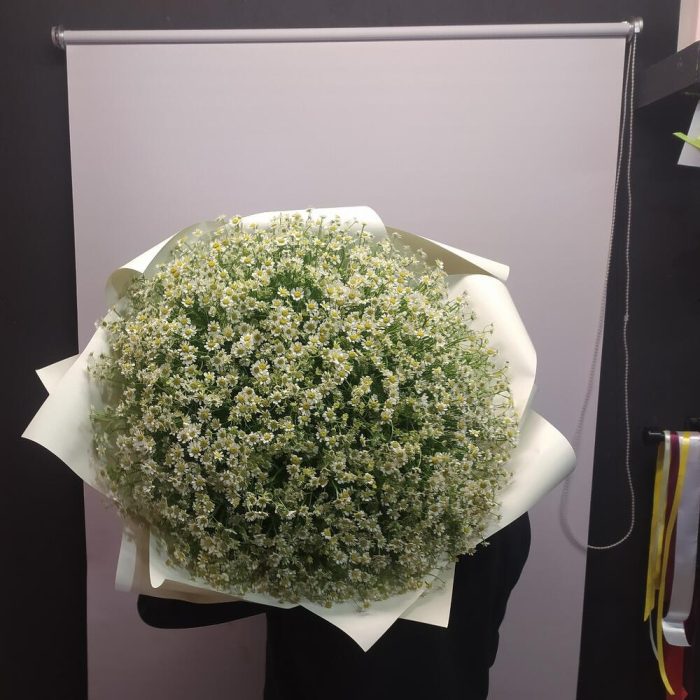 Матрикария (Ромашка Камила) – 101 шт.Упаковка дизайнерская – 1 шт.Лента атласная – 1 шт.