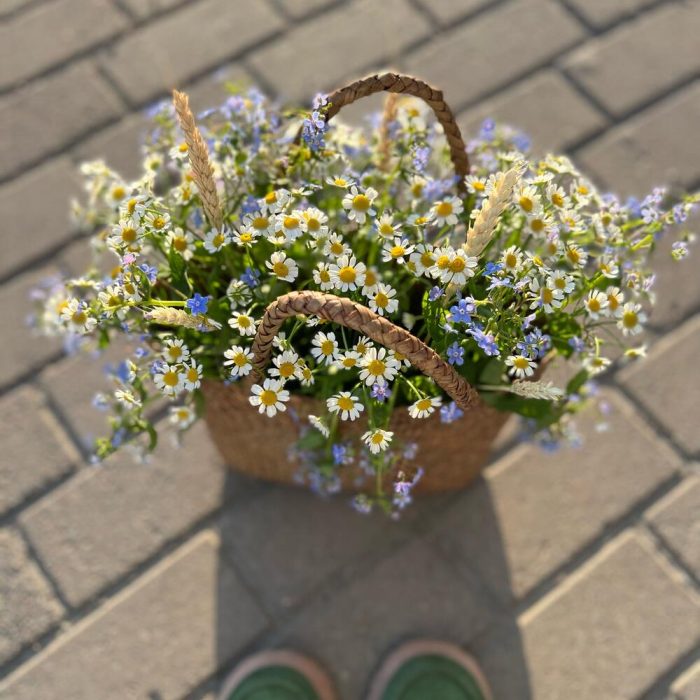 Ромашка кустовая – 5 шт.Колосья – 5 шт.Незабудка – 15 шт.Оазис флористический – 1 шт.Сумка плетеная ( ручная работа) – 1 шт.