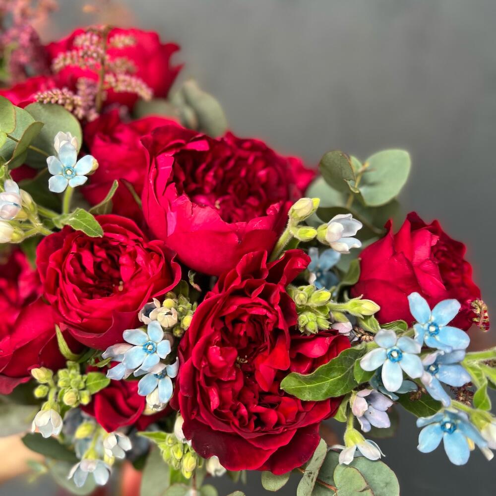 Роза пионовидная – 9 шт.Астильба – 4 шт.Оксипеталум – 11 шт.Эвкалипт – 7 шт.