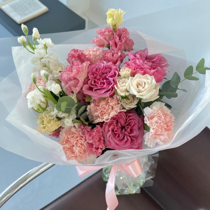 Маттиола – 2 шт.Эвкалипт – 1 шт.Кустовая роза – 3 шт.Гвоздика – 5 шт.Эустома – 1 шт.Пионовидная роза – 3 шт.