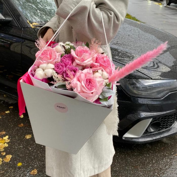 Роза – 5 шт.камыш декоративный – 1 шт.Хлопок – 5 шт.Роза пионовидная кустовая – 3 шт.Упаковка – 4 шт.Салал – 5 шт.Статица – 2 шт.мискантус – 4 шт.Сумка крафт – 1 шт.