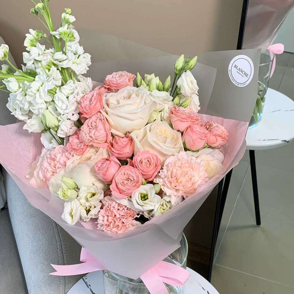 Лизиантус белый – 3 шт.Фирменная упаковка – 1 шт.Маттиола белая – 3 шт.Диантус розовый – 3 шт.кустовая роза madam bombastic – 3 шт.пионовидная роза white o’hara – 5 шт.