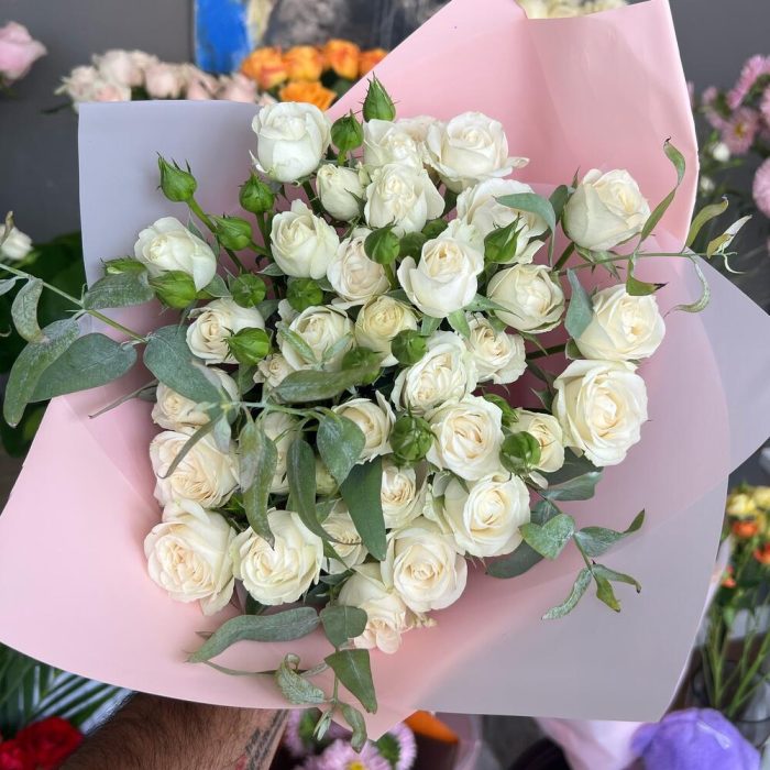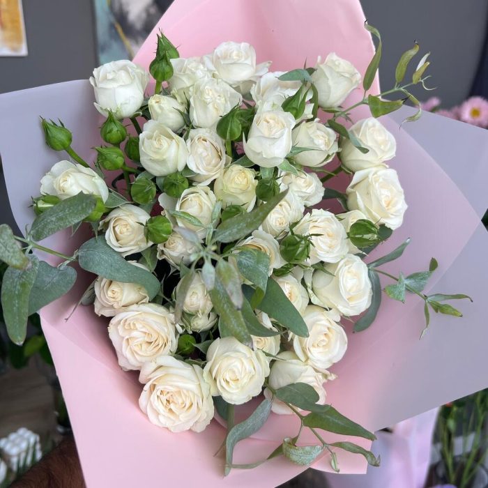 Авторский букет из французских и пионовидных роз с эвкалиптом