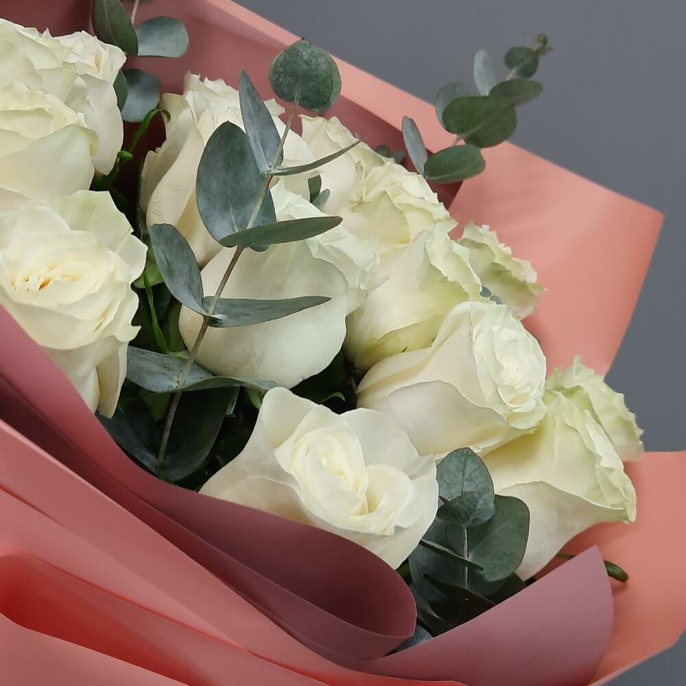 Белые розы и Эвкалипт ( 15 штук )