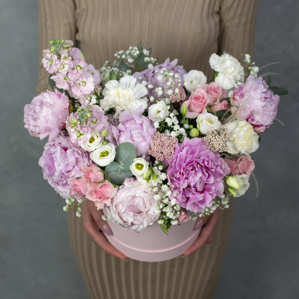 пионы розовые – 7 шт.маттиола персиковая – 2 шт.Гвоздика белая – 3 шт.Роза кустовая розовая – 4 шт.Лизиантус белый – 3 шт.Озотамнус – 2 шт.Гипсофила – 2 шт.пеннисетум – 1 шт.Эвкалипт – 1 шт.