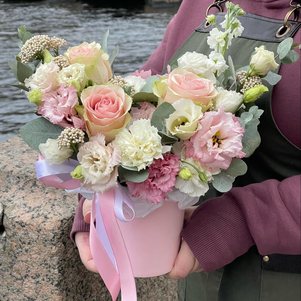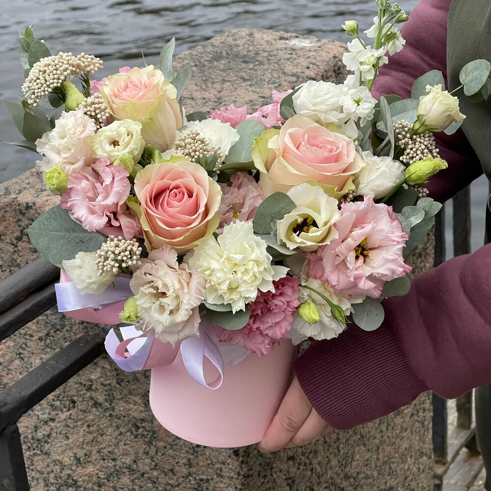 Маттиола – 1 шт.Озотамнус – 2 шт.Эвкалипт – 2 шт.Лента атласная – 2 шт.Диантус – 3 шт.Коробка шляпная – 1 шт.Оазис флористический – 1 шт.эустома розовая махровая – 2 шт.эустома белая – 1 шт.роза эквадор фруттето – 3 шт.