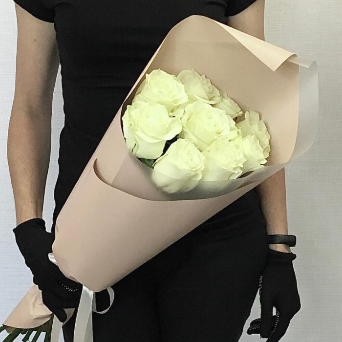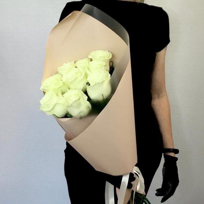 Роза белая – 9 шт. Упаковка дизайнерская – 1 шт. Открыточка с вашими пожеланиями – 1 шт. инструкция по уходу за цветами – 1 шт.