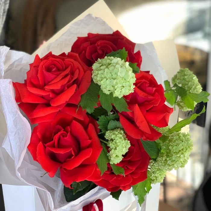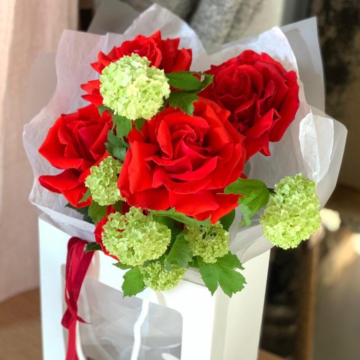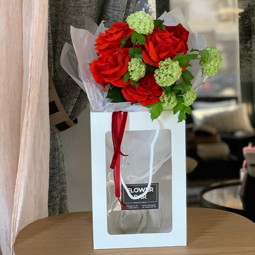 Вибурнум – 2 шт.Упаковка дизайнерская – 1 шт.Роза французская – 5 шт.лента текстильная – 2 шт.пакет с прозрачным окном – 1 шт.