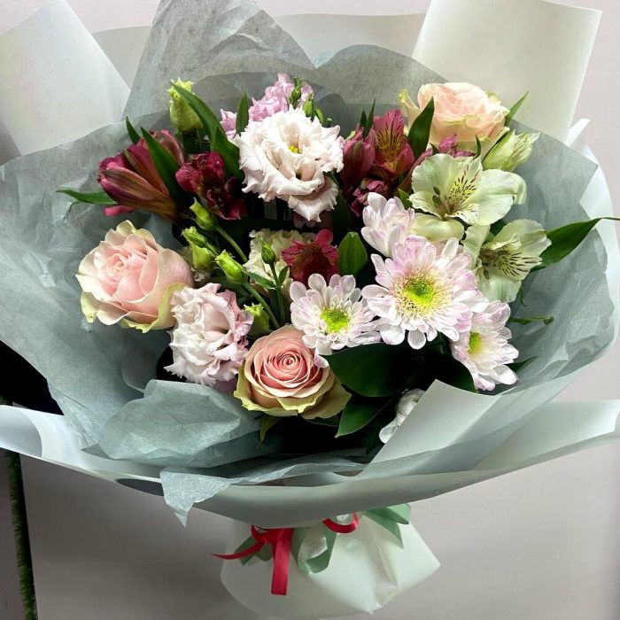 Альстромерия – 2 шт. Хризантема кустовая – 1 шт. Эустома – 2 шт. Роза Голландская – 3 шт. Упаковка дизайнерская – 1 шт.