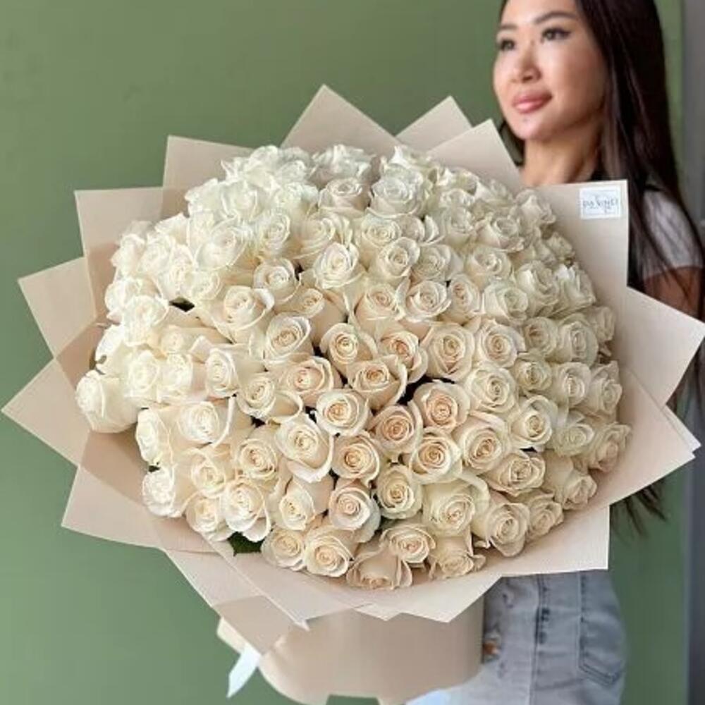 Шикарный букет из 101 голландской белой розы в оформлении. Заказав букет с доставкой от Da Vinci, Вы скрасите день обладательницы букета и подарите ей незабываемые эмоции.
