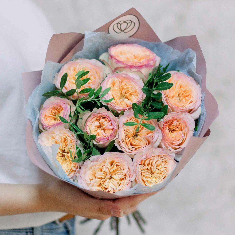 Букет из 11 персиковых пионовидных роз Flash Back 40 см с фисташкой