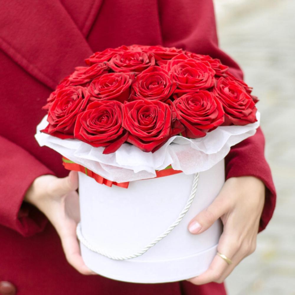 Букет из 19 красных роз в шляпной коробке