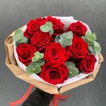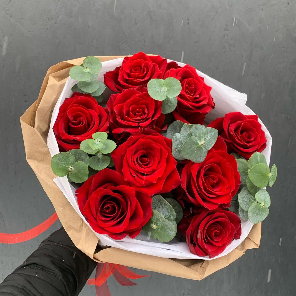 Роза – 9 шт.Эвкалипт – 2 шт.Упаковка дизайнерская – 3 шт.