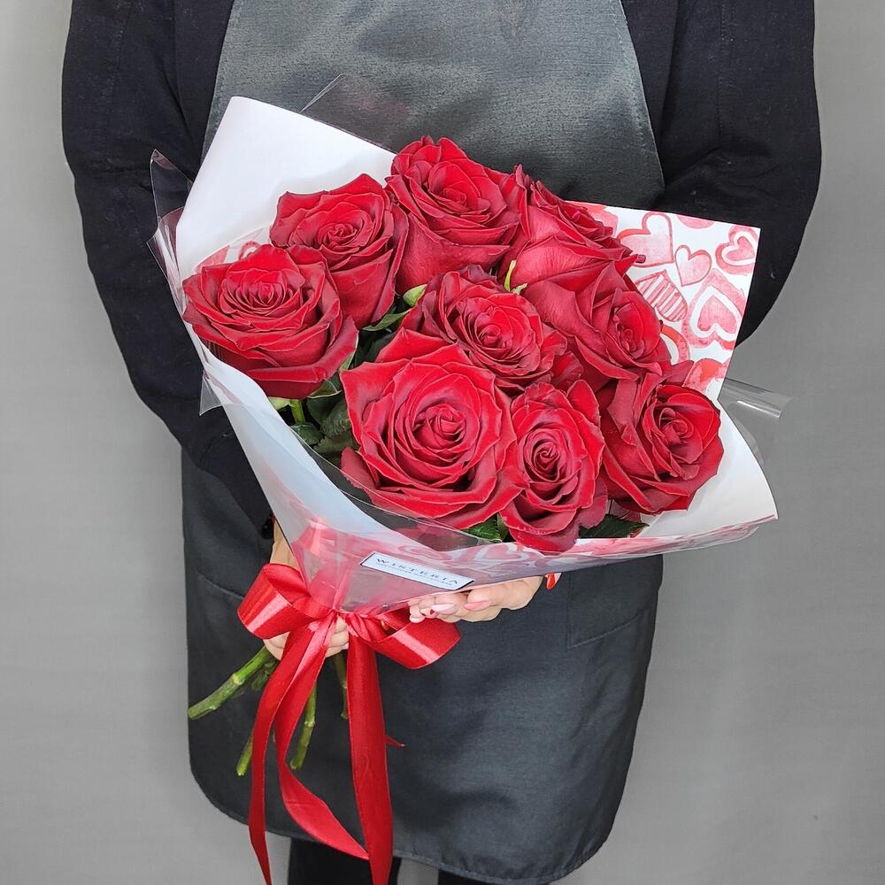 Лента атласная – 1 шт.Упаковка дизайнерская – 1 шт.Роза одноголовая эквадор – 9 шт.