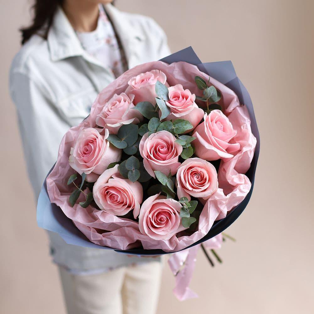 Букет из 9 нежных розовых роз и эвкалипта