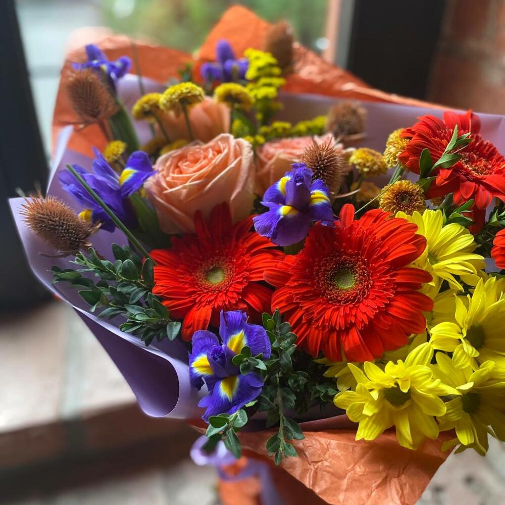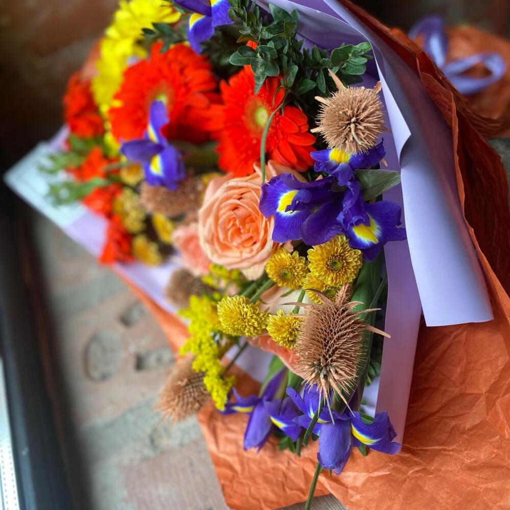 Букет из гербер, ирисов, кустовой хризантемы, пионовидных роз, самшита и эрингиума в стильной упаковке “Чистые краски осени”