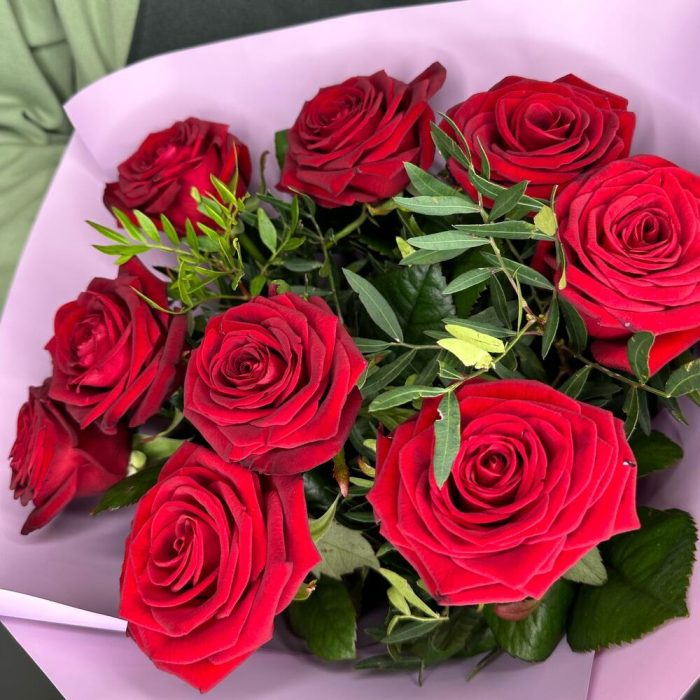 Лента атласная – 1 шт.Фисташка – 2 шт.Упаковка дизайнерская – 1 шт.Роза одноголовая россия – 9 шт.