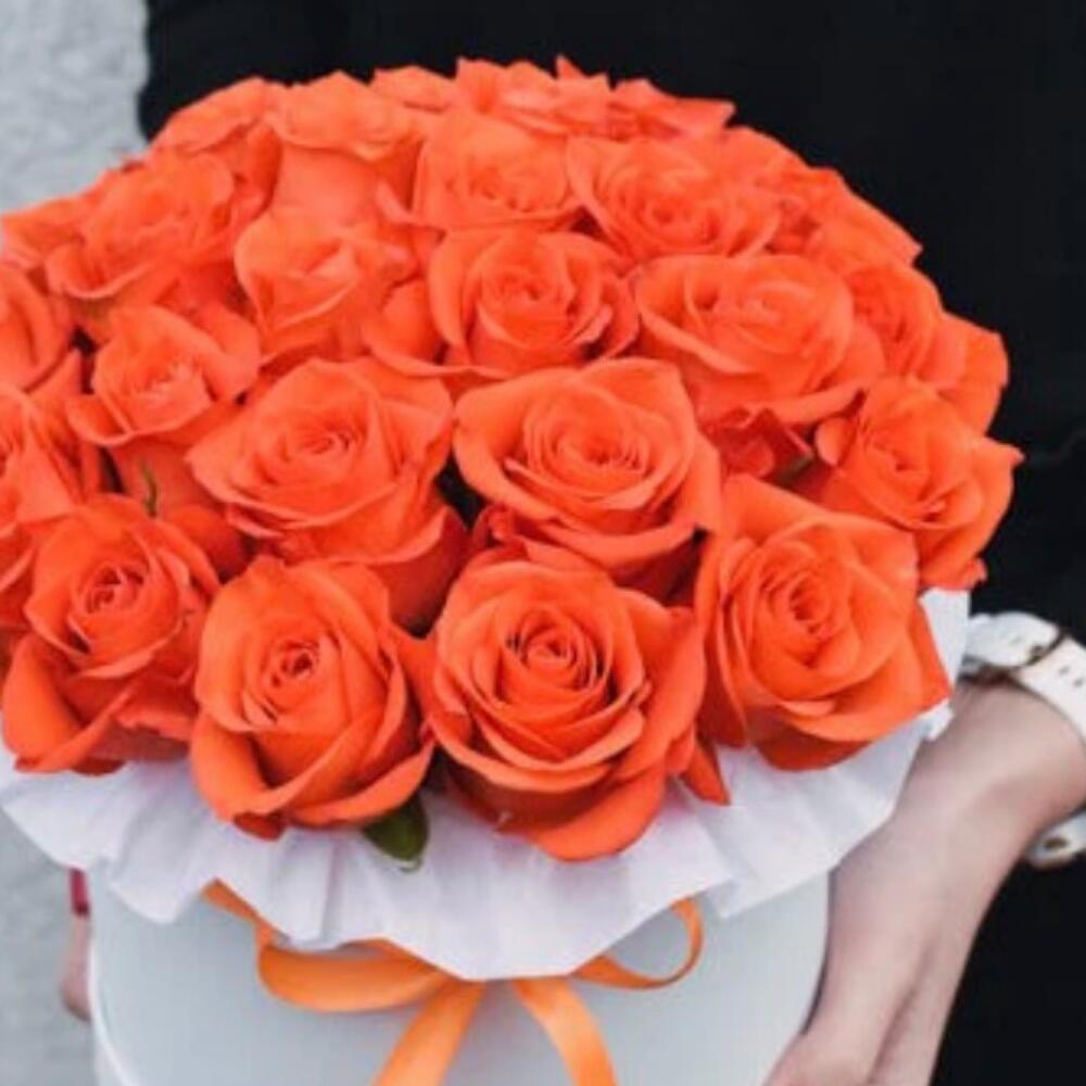 Роза оранжевая – 25 шт.Коробка шляпная – 1 шт.Лента атласная – 1 шт.Открытка – 1 шт.инструкция по уходу за цветами – 1 шт.хорошее настроение – 1 шт.Кризал – 1 шт.