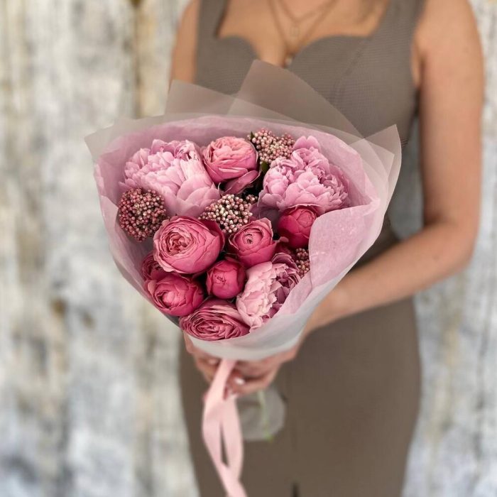 Озотамнус – 4 шт.Пион – 3 шт.Кустовая пионовидная роза – 2 шт.Дизайнерская упаковка – 3 шт.