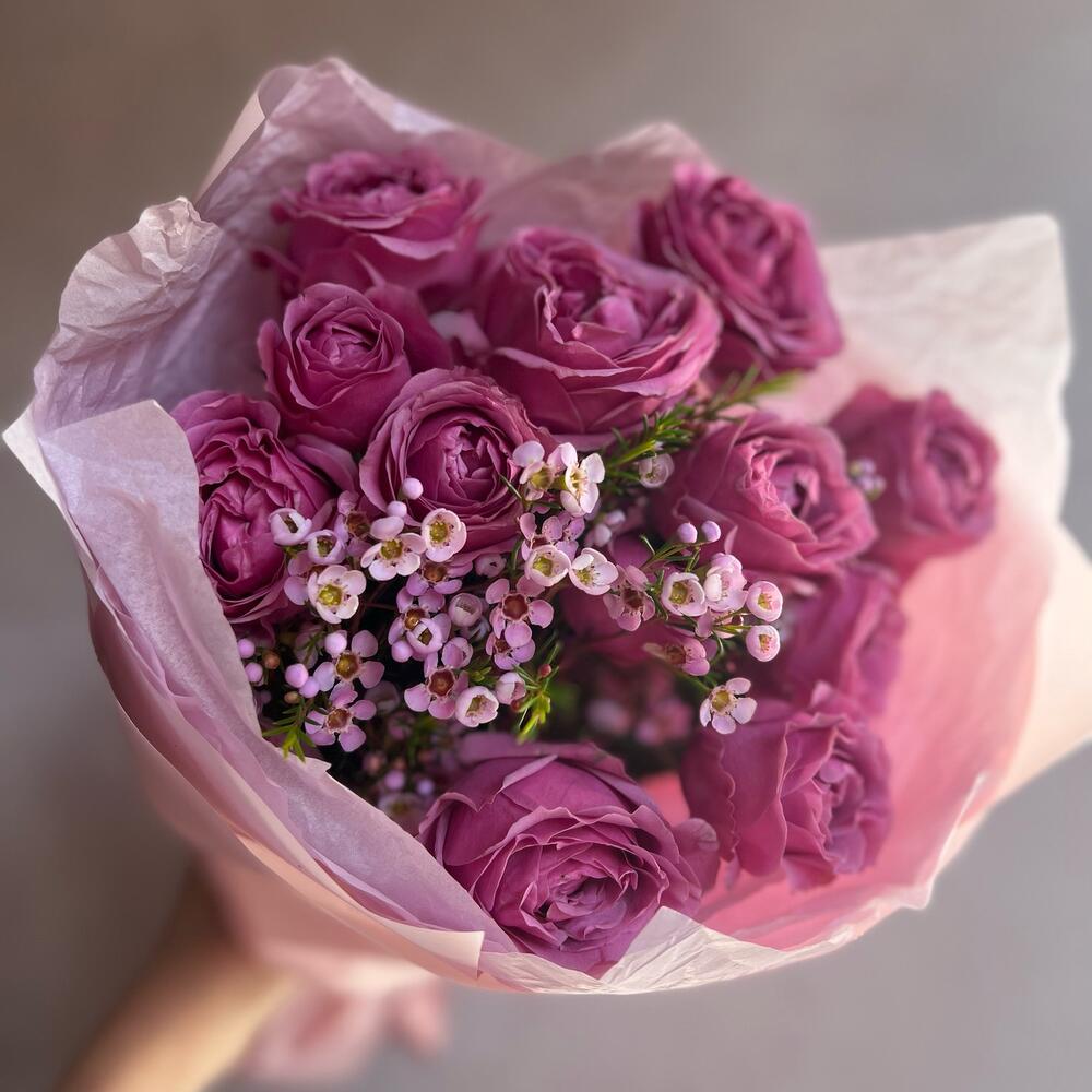 Кустовая пионовидная роза – 3 шт.Хамелациум – 1 шт.декоративная упаковка – 1 шт.Атласная лента – 1 шт.