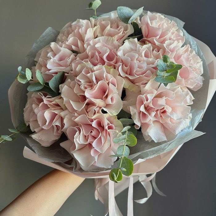 Пышный и ароматный букет из французских роз с эвкалиптом.