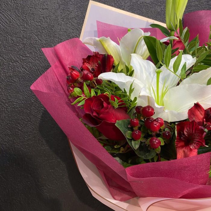 Лилия белая – 1 шт.Роза 50 см – 3 шт.Хиперикум красный – 3 шт.Альстромерия – 2 шт.Фисташка – 3 шт.Пленка матовая – 1 шт.Фетр – 1 шт.