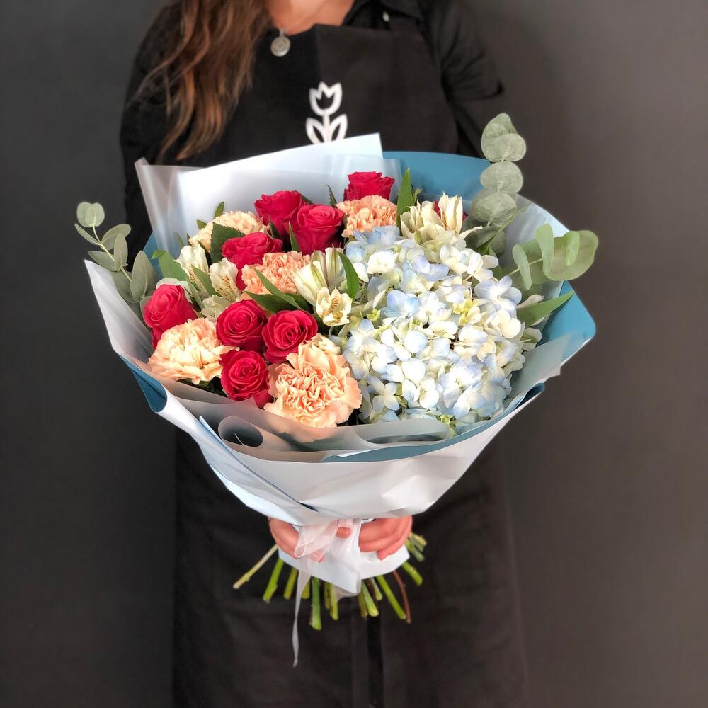 Гортензия – 1 шт.Роза Эквадор – 9 шт.Диантус – 5 шт.Эвкалипт – 2 шт.Альстромерия – 3 шт.Крафт упаковка – 3 шт.
