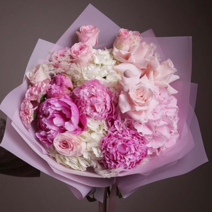 роза ассорти – 9 шт.Гортензия – 4 шт.Пион – 5 шт.Гвоздика – 5 шт.Упаковка дизайнерская – 1 шт.Лента атласная – 2 шт.Открыточка с вашими пожеланиями – 1 шт.хорошее настроение – 100 шт.инструкция по уходу за цветами – 1 шт.коробка переноска – 1 шт.Кризал – 1 шт.