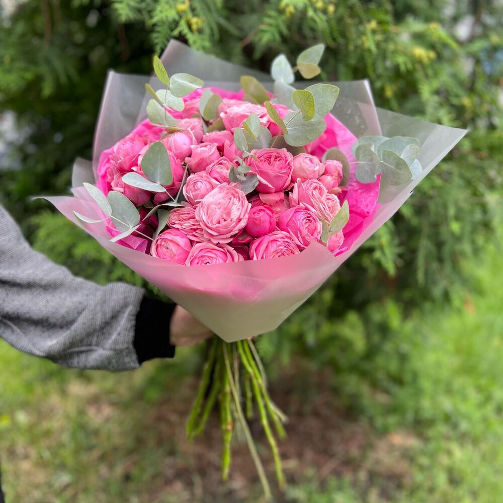 Роза пионовидная кустовая – 11 шт.Эвкалипт – 5 шт.Тишью – 2 шт.Пленка матовая – 2 шт.